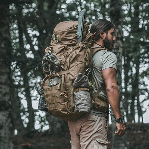 【MOLLE Webbing System】The hiking backpack is equipped with a MOLLE webbing system, which allows you to hang tools, trekking poles, tents, sleeping bags, and other accessories. Additionally, the side strap and pocket are designed to accommodate a rifle, providing added convenience for hunters.