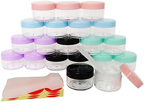 20pack 15g/15ml refillable container sample jars with screw up lids (Black Pink Purple Blue Green), FREE 20pcs spatulas + 20pcs markable labels.