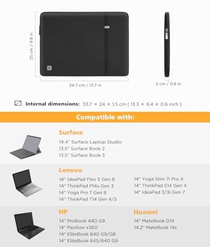 【Compatibility】The laptop sleeve is ideal fit for 13.5″ Surface Book 3 2 / 14.4″ Surface Laptop Studio / 14″ ThinkPad P14s Gen 3 / 14″ IdeaPad Flex 5 Gen 8 / 14″ Yoga Pro 7 Gen 8 / 14″ IdeaPad 3 Gen 7 / 3i Gen 7 / 14″ ThinkPad E14 Gen 4 / 14″ ThinkPad T14 Gen 3-4 / 14″ Yoga Slim 7i Pro X / 14″ Yoga 9i/7i / 14″ Chromebook 3 / 14″ HP ProBook 440 G9 / 14″ EliteBook 640/645 G9 / 14″ EliteBook 840 G8/G9 / 14″ Pavilion x360 / 14″ MateBook D14 / 14.2″ MateBook 14s / 14.6″ Galaxy Tab S8 Ultra.