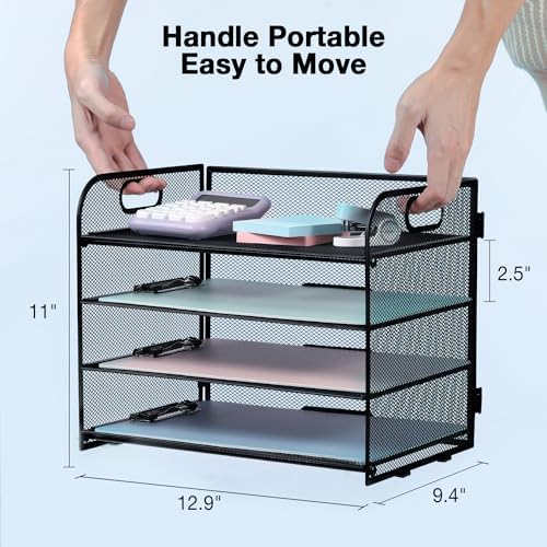 Mesh Desk Organizer Tray, 4-Tier Paper Letter Tray Organizer with Handle, Metal Desktop Document Shelf File Organizer for Letter/A4 Office Classroom Organization – Black