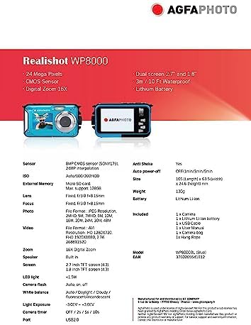 Waterproof and compact, the Realishot WP8000 digital camera from Agfa Photo will be the perfect companion for your vacation. Its CMOS sensor captures photos up to 24MP and FULL HD videos. The 2 screens 2.7” and 1.8” are very useful for selfies and viewing your photos. It is equipped with an 16X digital zoom. Practical, it works with a lithium battery and comes with a flash as well as an electronic anti-shake.