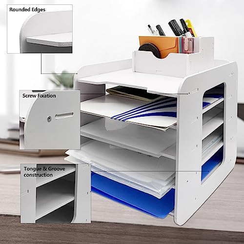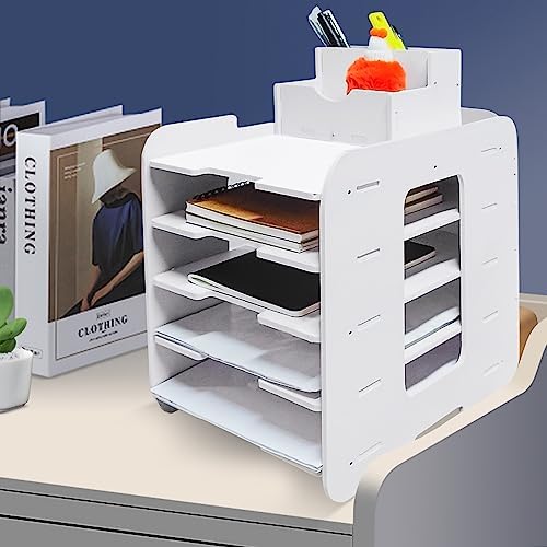 WAIZHIUA 5 Tier Desk File Organiser Letter Tray Paper Organizer Desk Tidy Organizer File Document Holder A4 Size Filing Trays with Pen Holders for Home Office School