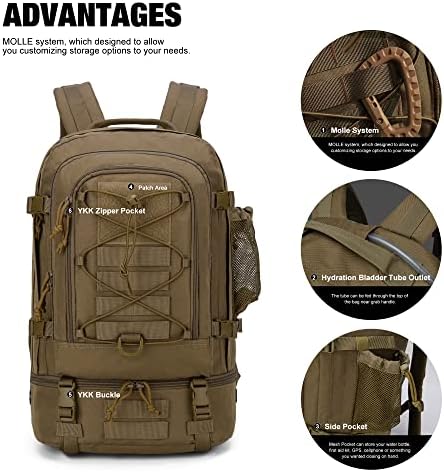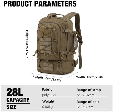 🌵 Comfortable and durable. This military backpack is made of 600D polyester fabric and high-quality nylon, which is not easy to stain, abrasion and tear resistance, very durable and practical. High-quality YKK buckles and smooth zippers make it easy to open and close. Adjustable shoulder straps are more comfortable and reduce shoulder pressure.