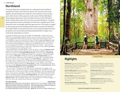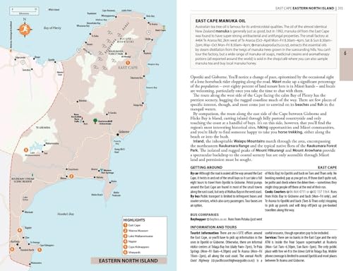 Clear structure within each sightseeing chapter of this New Zealand travel guide includes regional highlights, brief history, detailed sights and places ordered geographically, recommended restaurants, hotels, bars, clubs and major shops or entertainment options.