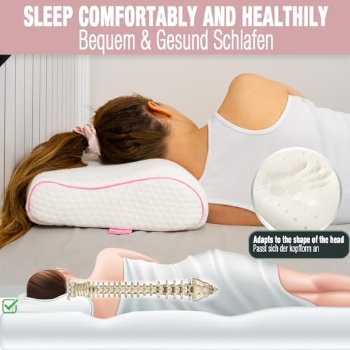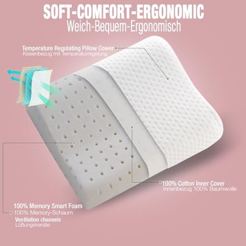 ✔ THERMOREGULATION PILLOW CASE- Temperature-regulation fibers in the thermo cover provide thermal management that dissipates heat when you get cold and emits heat when you get hot keeping it at the ideal temperature all night. It is soft, hypoallergenic and made according to the OEKO-TEX standard with natural materials. The dust-proof 100% cotton inner cover extends the life of the memory foam core more effectively. You get a long-lasting sleeping comfort. Cover washable at 40°C