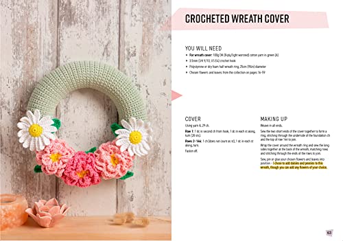 Once you’ve crocheted your blooms, use them to embellish clothing, accessories and homewares. Inside, you’ll find advice on making stunning wreaths with your flowers; there are also instructions for crocheting a wreath cover, so you can have a permanent, gorgeous flower display to hang in your home.