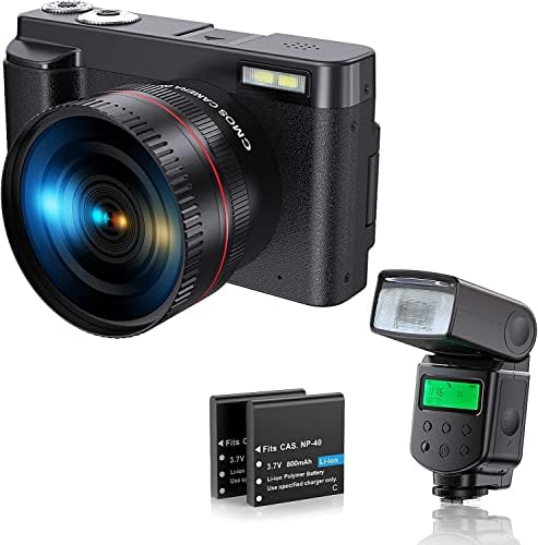 Video Camera with External Flash : The camera is equipped with a detachable flash. The flash has 4 different modes to meet the needs of different scenes, you don’t need to purchase it separately. Product packaging includes 1*Digital Camera, 2*Rechargeable Li-ion Battery, 1*USB Cable, 1*User Manual, 1*Ultra Wide-Angle Lens, 1*speedlite, 1*macro lens