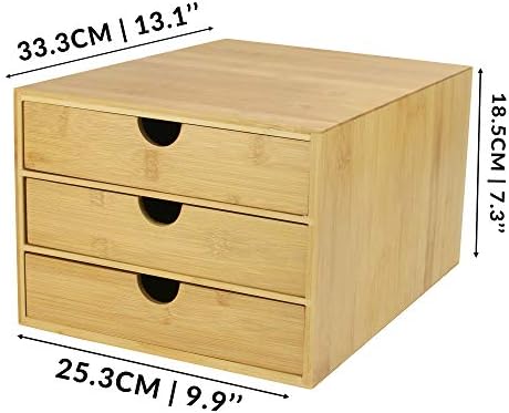 Size Unit: 33.3cm (W) x 25.3cm (L) x 18.5cm (H), Internal drawer dimensions (per drawer): 31.2cm (W) x 22.1cm (L) x 4.3cm (H) Material Bamboo In the Box 1 x Bamboo Desktop 3 Drawer Our Own Images All product images 2020 Maison & White (Xbite Ltd)
