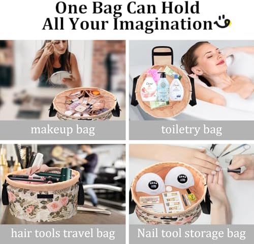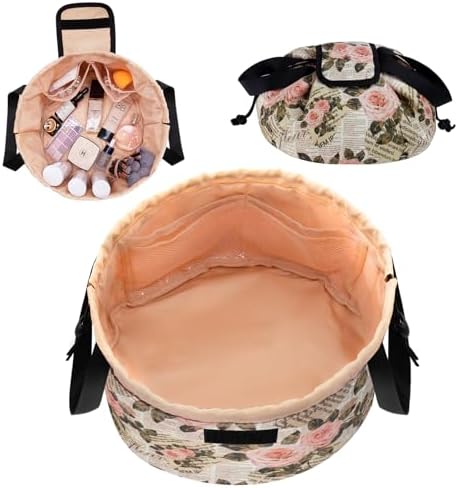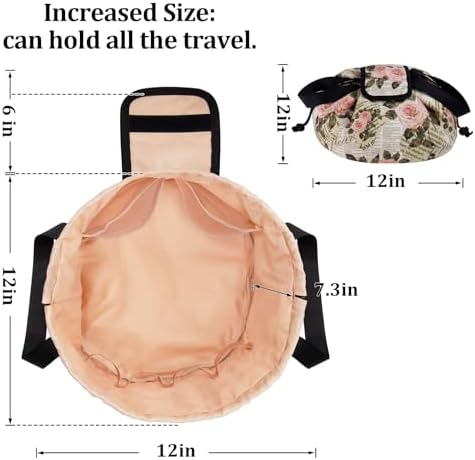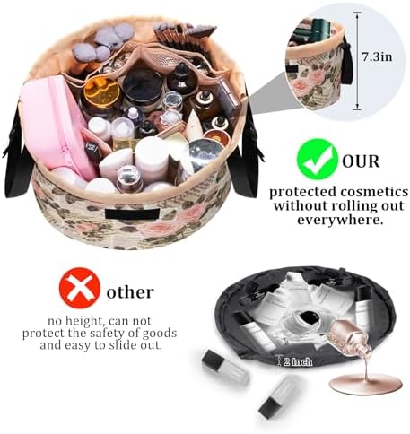 💕 CAPACITY UPGRADE:Our barrel drawstring makeup bag size is 12″ x 12″ x 7.3″,which is large enough to hold all the essentials for a weekend trip or daily use. This makeup organizer bag easily fits travel-sized toiletries or full-sized skin-care products such as lipstick, lotion, facial cleanser, make up remover, foundation, concealer, eye shadow, powder etc.;