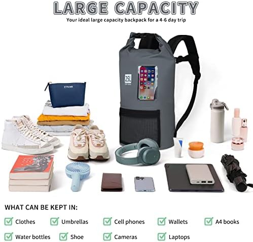 The 25L bag backpack popular size is big enough to fit in everything needed for a long trip out on the boat or to the beach. You can used for packing smaller belongings such as wallets, keys, towels, and cameras or protecting clothes, shoes, tablet PC, bath towel, flashlight, telescope, and notebooks. This bag backpack is the perfect travel companion for camping, mountaineering, cycling, kayaking, rafting, fishing or just going to the beach!