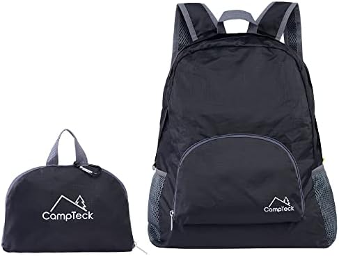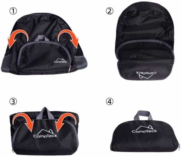 The CampTeck foldable rucksack is perfect for day-to-day use or day trips, vacation, travel, school, hiking, cycling, camping, and shopping. Makes a great gift for everyone. The foldable travel backpack is made from ripstop polyester fabric, provide strengthen and long-lasting performance with minimal weight, while being water resistant to rain showers or spills. Five compartments – main pocket is large enough to carry belongings. Small inside pocket is perfect for keeping small items safe, with two side mesh pockets for your umbrella or bottle and a front pocket to keep items such as a wallets or keys for quick and easy access. The large foldable backpack is easy to setup and fold back into its containing pocket, which has a carabiner and carry handle. Once folded it can hook onto your other items. Specifications: