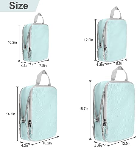 TRAVEL COMPANION: This packing cubes set includes: one XL (17″ x 12.6″), one L (13.8″ x 12.6″), one M (13.8″ x 9.8″), one S (11″ x 6.7″).Perfect match your luggage.