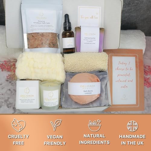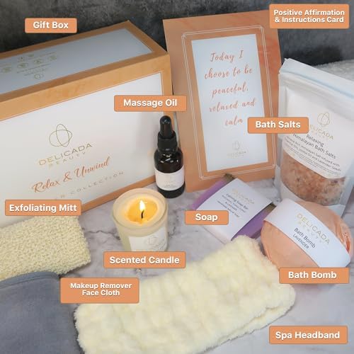 🛁 RELAX & RESTORE: The Deluxe Relax & Unwind Pamper Box includes all the essentials for a truly pampering experience: Relaxing bath salts, exfoliating bath mitt, scented candle, calming soap, massage oil, jumbo sized bath bomb, microfibre makeup remover face cloth, and ultra soft spa headband.
