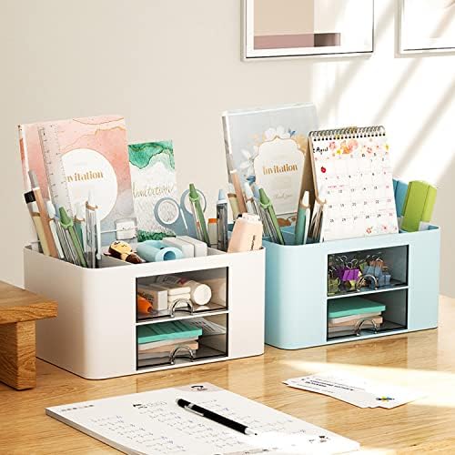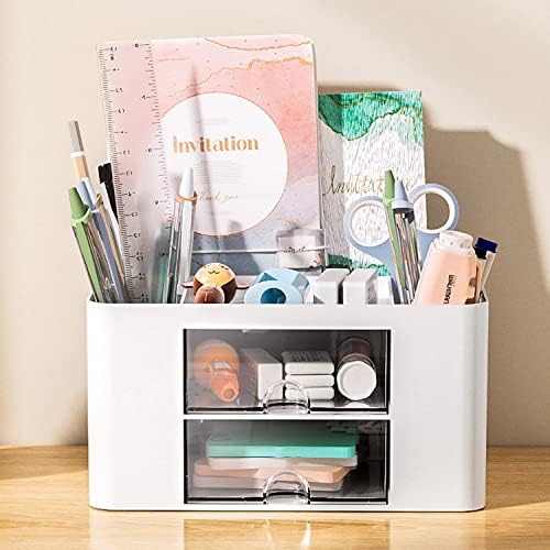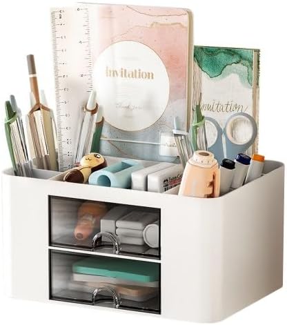 Partition Design: The desk storage box has 5 compartments and 2 transparent drawers. You can sort and store daily necessities. Clear drawers let you quickly and easily find every small item in the organizer. Great for storing staples, pens, paper clips, binder clips, notepads, sticky notes, washi tape, glue sticks and more. Never lose your small office supplies.
