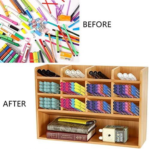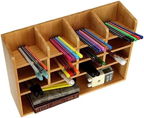 Dicunoy art organizer is made of bamboo material with unique solid exquisite texture. It is polished and carefully crafted by professional handmade craftsman, which makes it stable, durable and healthy in your daily use. And it could a perfect gift choice for your friend or family.Our bamboo art organizer comes with 3 layers and 12 angled tilt compartment slots, a flat bottom shelf and a simple drawer which will offer enough space to store various items. A unique design will help you to arrange the desk gadgets well, keep your place tidy, and help you find your things quicker and easier.