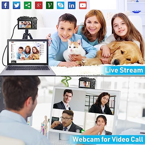 1. This 4K vlogging camera can be used as a webcam for YouTube & Skype,TikTok, Facebook live streaming or make video calls with your family and friends; also you can connect the camera to HDTV via HDMI cable to playback HD photos and videos.