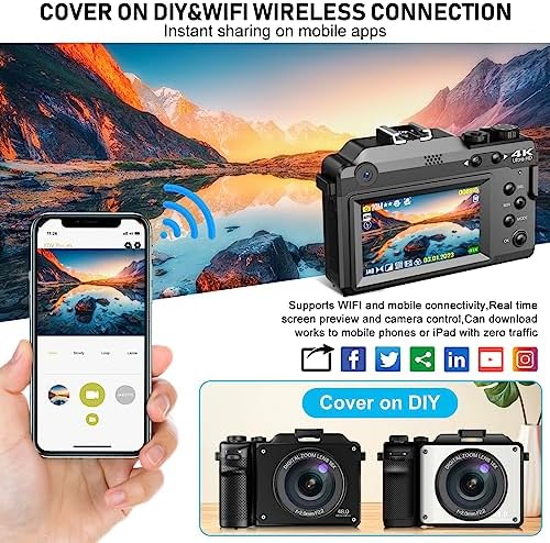 โนใMultifunctional 4K Point and Shoot Cameraใ4k digital cameras for photography have multi-function,such as DIY panel, dual cameras, continuous shooting, anti-shake,face capture,And video pause function helps save editing time and memory, and time-lapse and slow-motion features create the creativity you want!