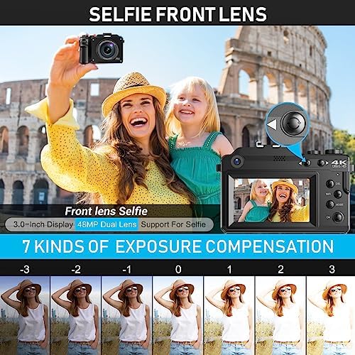 4k Compact camera supports shooting FHD 4K video (3840*2160P & 60FPS) and 48MP crystal-clear images, It equipped with 3.0 Inch screen,18X digital zoom, 1800mAh battery and 64G SD card. Great for travelling, meeting, studying and kids/ beginners/ students/ olders record their lovely moments.