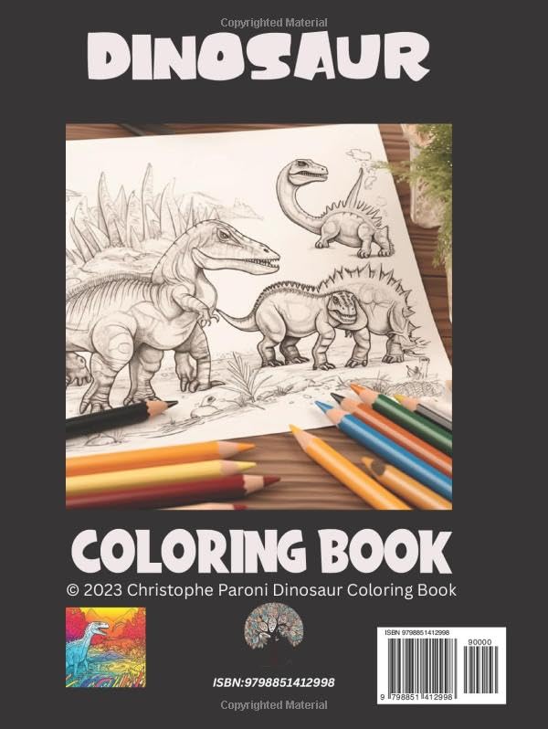 Dinosaur Coloring Book for kids age 4-1264 pages Dinosaur Coloring Book – New Edition 2023Black and White Coloring Book for Summer 2023High Resolution Quality of Dino Illustrations to colorEach Coloring Page Is On One Sheet. Printed One Sided. Don’t Worry About Bleed Through.8,5 inches x 11 inches, hardcover versionFrequently Gifted. This coloring book makes the Perfect Gift For Christmas, Summer Holidays, BirthdayGet ready to embark on a prehistoric adventure with our brand new Dinosaur Coloring Book, designed to captivate and challenge young minds aged 4 to 12! With 64 pages filled with intricate and mesmerizing mandalas featuring a variety of fierce dinosaurs, including the mighty T-Rex and the majestic Ankylosaurus, your child will learn to focus and concentrate like never before. Stop screen , color now ! Watch as they sharpen their coloring skills and hone their attention to detail, all while exploring the fascinating world of dinosaurs. Perfect for both boys and girls, this coloring book is sure to provide hours of fun and educational entertainment. Order it today before hyperinflation eats the Dynosaurs !