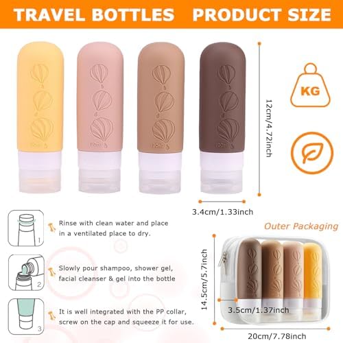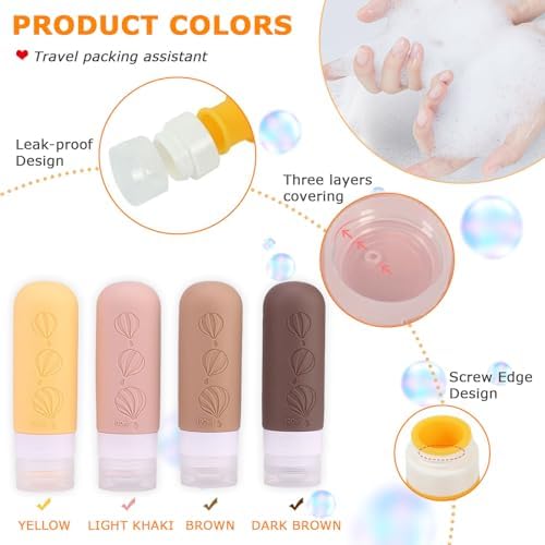 【Leak-Proof Travel Bottles Set】Our travel size toiletries 90ml set includes 4 in creamy yellowght khaki/dark khaki/brown travel bottles and a zippered bag. Featuring a 3-layer leak-proof design, it prevents liquid from leaking or spilling, providing protection for your luggage and clothes, and making your travels more convenient and comfortable.