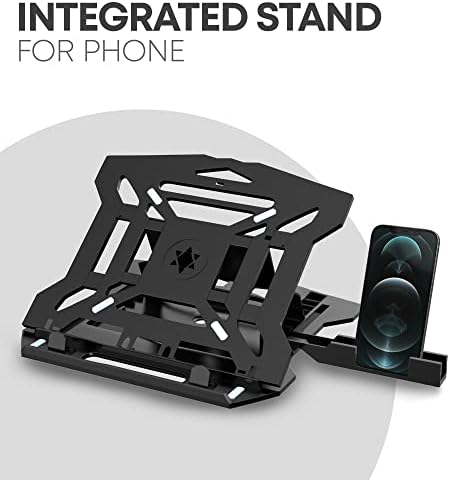 EXQUISITE WORKMANSHIP: Laptop holder is made from ABS material with rubber footing to prevent slippage and scratch damage to tables or desks. The surface of the bracket is covered with rubber protective stickers to avoid from risking of any scratches to your devices. Additionally the cooling bracket comes with a mobile holder attached to it.