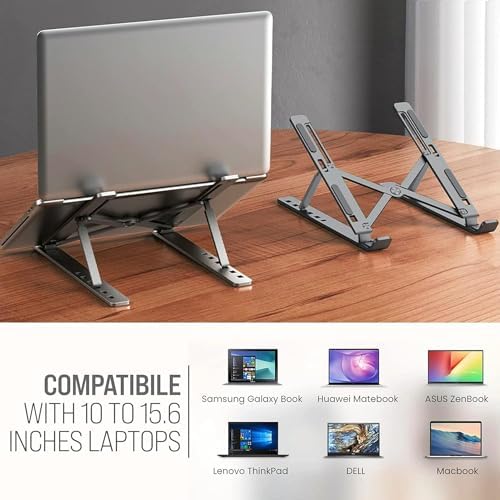 💻 [ UNIVERSAL COMPATIBILITY ] : The DYAZO Laptop Stand is compatible with any laptop or notebook of 10-15.6 inches, such as Macbook, Samsung Galaxy Book, Lenovo ThinkPad, Asus ZenBook, Huawei MacBook, and more. It also supports up to 10 kg of weight and has a protective hook and a nonslip silicone pad to keep your laptop secure and stable on the stand.