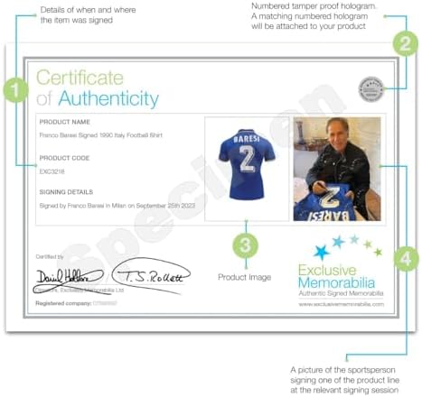This Italy shirt was signed by Franco Baresi on September 25, 2023 in Milan. This style jersey was worn by Italy and Baresi in the 1990 World Cup. Baresi was named in the World Cup All-Star Team after his impressive tournament where Italy finished third in the competition. Baresi made 81 appearances for his country, playing in two World Cup tournaments, two European Championships and the 1984 Olympics.