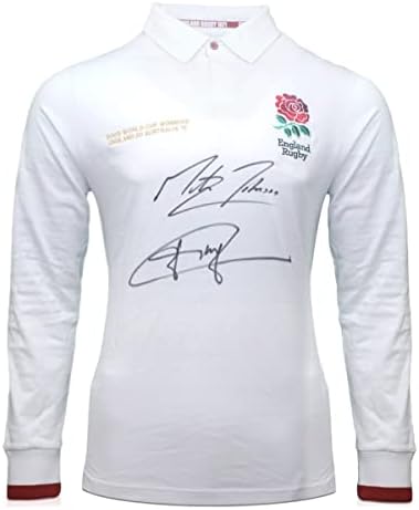 This England rugby shirt was signed by Martin Johnson on September 23, 2022 in Bristol and Jonny Wilkinson on May 17, 2023 in Bagshot. Both Johnson and Wilkinson played pivotal roles in England’s victorious 2003 World Cup campaign. Johnson famously captained England and Wilkinson scored the winning drop-kick in the dying seconds, which won the game 20-17 against Australia.