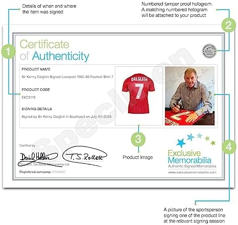 This Liverpool shirt was personally signed Sir Kenny Dalglish on July 4th, 2023 in Southport. This style shirt was worn in Dalglish’s first season as player/manager for Liverpool. In this season Liverpool won the double, winning the First Division and the FA Cup.