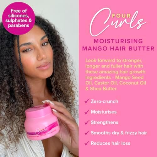 ENHANCED CURL DEFINITION: Experience the joy of defined, bouncy curls with our Four Curls Moisturising Mango Hair Butter. A perfect blend for curly hair products, it offers salon-quality definition and hold, making your curls feel soft and look luscious. This curly hair cream is designed to lock in style and moisture, ensuring your curls stay vibrant and frizz-free.