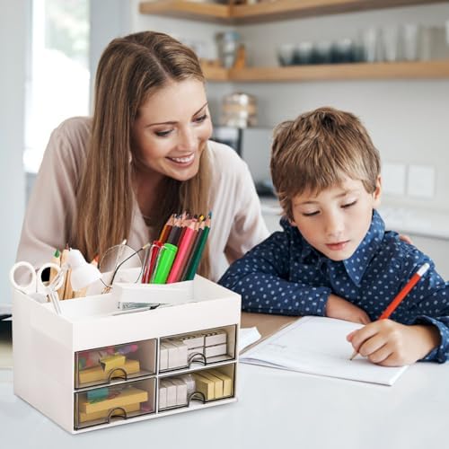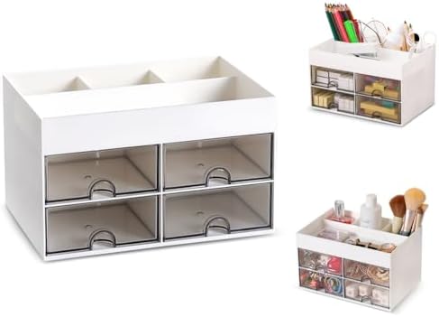ăVersatile and Multi-FunctionalăThis desk organiser designed with 4 compartments and 4 transparent drawers, Desk Supplies Organisers can sort and store most desk accessories, such as pens, office utensils, brushes, remote controls, and cutlery, is not only suitable for office use but also perfect for school and families.