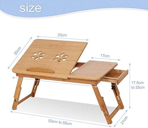Practical Design: The adjustable laptop holder has an exquisite hollow shape and two flowers on the surface, which can easily dissipate heat. The stopper prevents the thigh from slipping off the table. Foldable and extended legs for easy storage