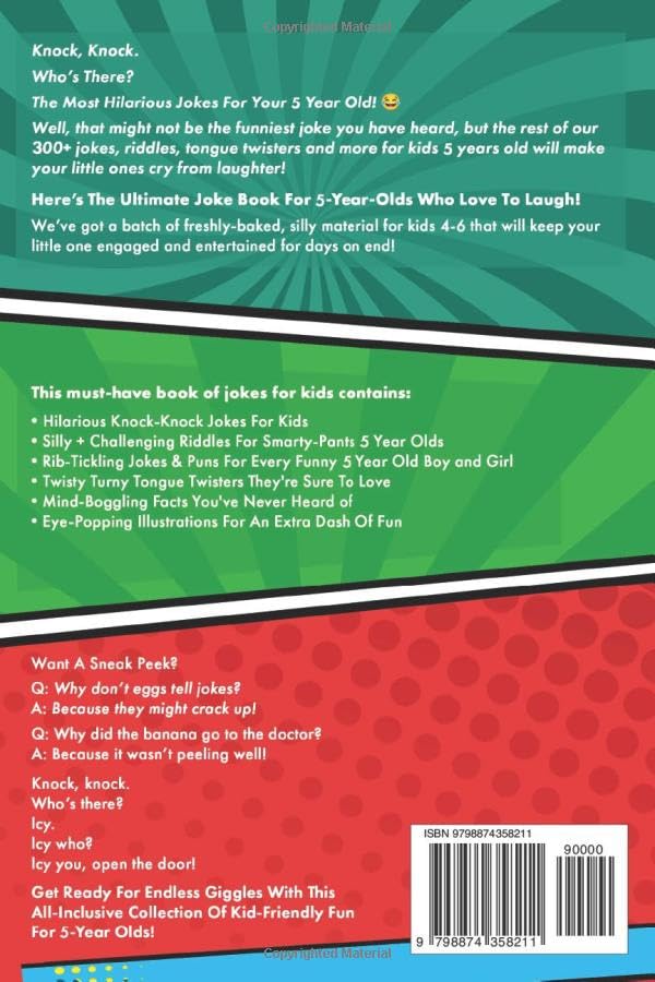 Introducing ‘Hilarious Jokes For 5 Year Old Kids’by Hayden Fox! This must-have book of laughter and excitement contains over 400 items:Hilarious Knock-Knock Jokes that’ll become instant favoritesBrain-Boosting Riddles to challenge and intrigueTwisty Tongue Twisters for endless funFascinating Facts that’ll surprise even adultsVibrant Illustrations that leap off the page