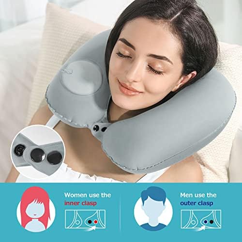 šćAdjustable Double Buckleć The inflatable travel pillow with adjustable double buckle, free to adjust the neck size and keep neck pillow in place around your neck, give your head & neck comfortable support, sleep comfortable without neck pain or head drops on your trip. Make a better fit between the neck and the U-shaped pillow, women can use the inner buckle, man can use the outer buckle.
