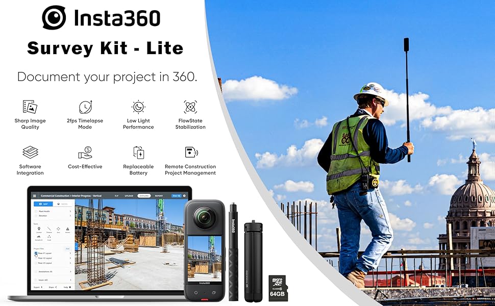 The Insta360 Survey kit Includes The insta360 X3, Invisible Selfie Stick, All Purpose Tripod and a 64GB SD Card.