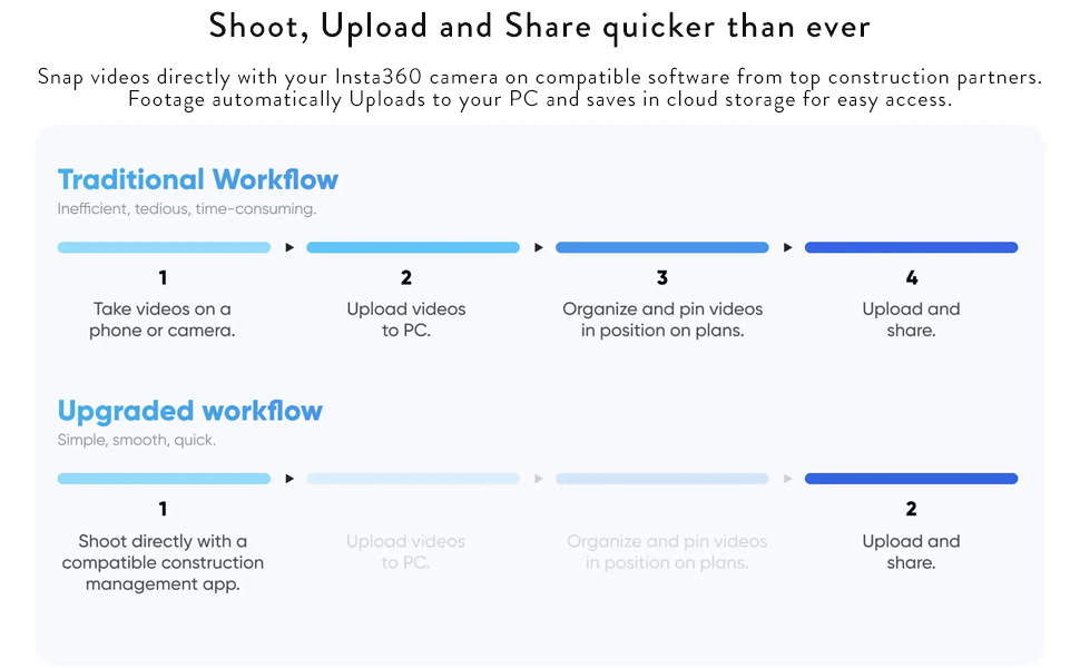 Connect your Insta360 camera to compatible construction management software, hit record and walk around the site to collect project data efficiently