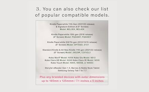 New slim velcro grip technology with ANY kindle or branded eReader within 185mm x 130mm x 20mm in size (see video below product images). Works with ALL Kindle Paperwhite models including the latest 2021 devices with a 6.8 inch screen.