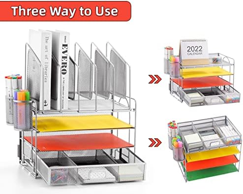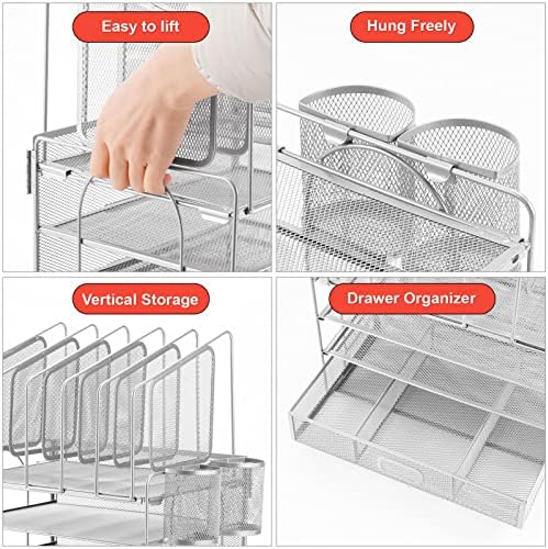 📂【Perfect Desktop File Organizer】Our Office Desk Supplies Organizer is made of 4 sliding trays + 2 Hanging Pencil Holders + 1 sliding drawer which has enough storage space to accommodate all office supplies, such as pens, pencils scissors, folders and Letter/A4 Size Paper