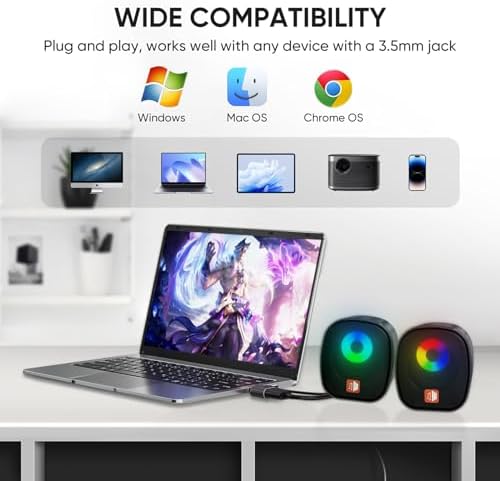 【Type c Adapter Included & Compatibility】 Plug and Play computer speakers with USB C to USB adapter, suitable for computers, laptops, iMacs, MacBooks. Compatible with various operating systems like Windows, Mac OS, Chrome OS, Linux, and UNIX.