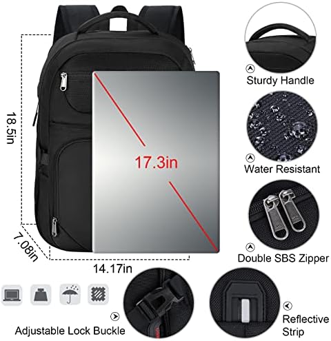 ✈【Breathable & Comfortable】: The 17 inch laptop backpack with a back three-dimensional ventilation design help for ventilation and heat elimination. Comfortable breathable mesh shoulder straps with plentiful sponge pads help relieve the stress from your shoulder. A luggage belt helps to free your hands and back when traveling. The travel laptop backpack provides you with a comfortable travel experience. It is perfect for college, travel, hiking, camping, business, and outdoor activities.