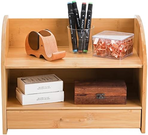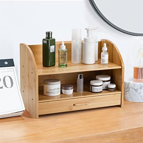 Okllen Bamboo Desk Organizer, Natural Wood Shelf Organizer for Desk with Drawers, Tabletop Bookshelf, Cosmetic Storage Organizer
