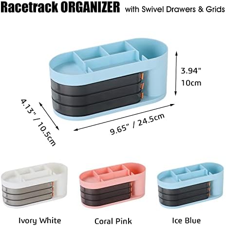 RACETRACK & 3 DRAWERS. This art storage drawer has 3 swivel drawers and 5 compartments, the overall W x D x H dimension is: 9.65″ x 4.13″ x 3.94″ / 24.5 x 10.5 x 10cm. The desktop drawers and holders are suitable for bath preparations, makeup supplies, can also be used as a mobile phone holder to place the phone horizontally and free your hands.