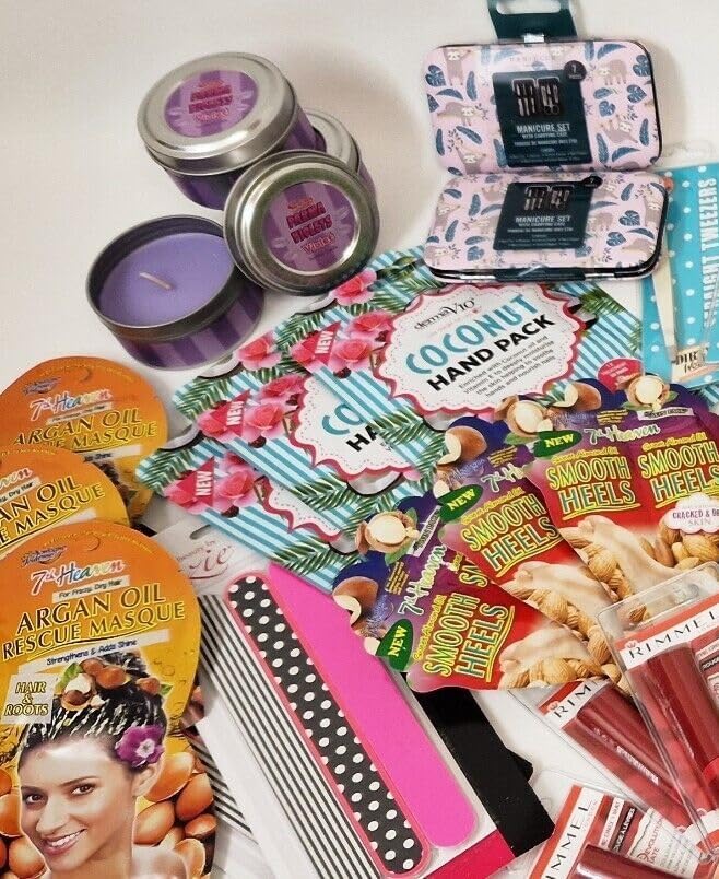 40 PIECE SUPER VALUE BEAUTY BUNDLE – Each box has a good mix of brand new items such as Beautiful Face packs, Hand and Foot Packs, Lip Treatment, Essentials beauty tools like Tweezers & Nail Files, Manicure Sets, Body Butter, Foot Lotions, Lip Balm, Lipstick, Scented Candles and Other pamper items. MAKE YOUR OWN GIFTING HAMPERS OR FOR PARTY BAGS, TABLE GIFTS, SELF PAMPER, BRIDESMAIDS, GIRLS NIGHT IN, PAMPER PARTY, VALENTINES TREAT OR MOTHERS DAY ETC.