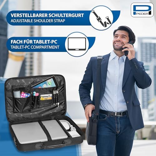 Modern companion for your accessories The modern PEDEA shoulder bag is a laptop bag for everything you really need. The main compartment accommodates a notebook up to 18.4 inches (46.7 cm), as well as a smartphone, travel reading, A4 notepad, and pens (integrated pen holder). A Velcro pocket on the front houses power supplies, cables, external hard drives, mice and other supplies. Long, smooth-sliding zip give you easy access to your essentials. Features a soft lining, thick padding, and a water-repellent rain cover to protect your laptop against scratches, moisture, and shock Highlights: – External dimensions: 50 x 39 x 7.5 cm (WxHxD); laptop compartment: 45 x 35.5 x 5.5 cm (WxHxD) – Practical compartments for accessories such as smartphone, external hard drives, mice, cables, pens, travel reading, or an A4 notepad: ideal for school, university and work – Features a robust protective frame, thick padding, and a water-repellent rain cover to protect your laptop against scratches, moisture, and shock – Long, smooth-sliding zips for easy access to your laptop or accessories – Comfortable transport thanks to infinitely adjustable shoulder strap; strap length: max. 124cm – Colour: black – Weight: 950g – Package includes: Laptop bag, shoulder strap Compatible with these and other models (check inside dimensions): – HP Omen 17-an025ng, HP Omen 17-an013ng, HP Omen 17-an029ng, HP Omen 17-an023ng – Acer Aspire V 17 Nitro Black Edition VN7-793G-5811, Acer Nitro 5 AN515-52-7231 – Asus ROG GL702VM-BA322T, ASUS ROG GL753VD (90NB0DM2-M04850), Asus ROG GL702VM-BA323T, ASUS ROG Strix SCAR II GL704GM (90NR00N1-M00380) – Asus Strix GL753VD-GC337T, Asus TUF Gaming FX705GE 90NR00Z2-M02900, Asus TUF Gaming FX705GM 90NR0122-M02960 – MSI GV72 8RE-048, MSI GL73 8RE-688DE – Medion Erazer P7643 MD 99836 – Dell Gaming Laptop G3 17 3779-9457
