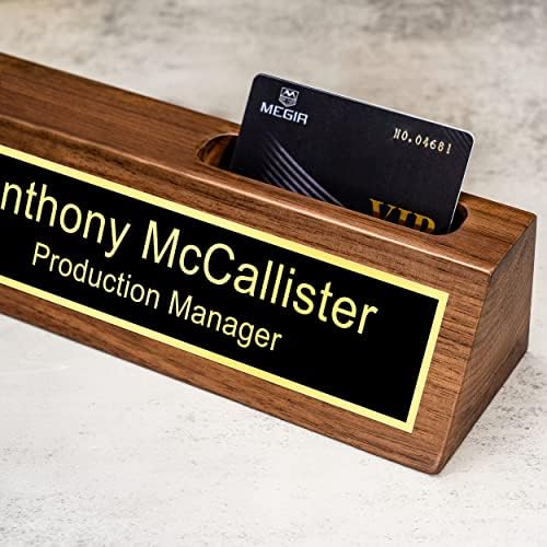 Desk Name Plate Personalized: When it comes to finding a desk name plate that’s personalized, this Walnut block with business card holder will compliment your office decor perfectly.