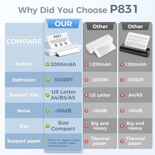 Large Capacity Battery mobile Printer: PhoFuta P831 portable printer for phone internal 2000mAh battery provides an exceptionally long operating time, enabling the printing of approximately 120 documents after a full charge. This is particularly advantageous for users who are frequently on the travelling or working in locations where a direct power connection is not available,PhoFuta P831 portable small printers for home as well as a good partner for your children study