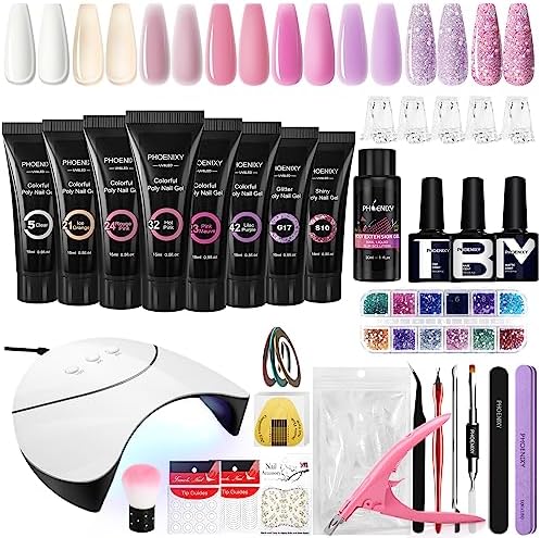 Phoenixy gel nail kit provides essential manicure tools, 8×15ml poly nail gel, 36W U V/LED nail lamp, 1×8ml base coat, 1×8ml top coat, 1×8ml matte coat, 30ml glide solution, 5 nail clips and some basic nail tools. This professional quality gel nail kit allows you to have fun with gel nail art at home.