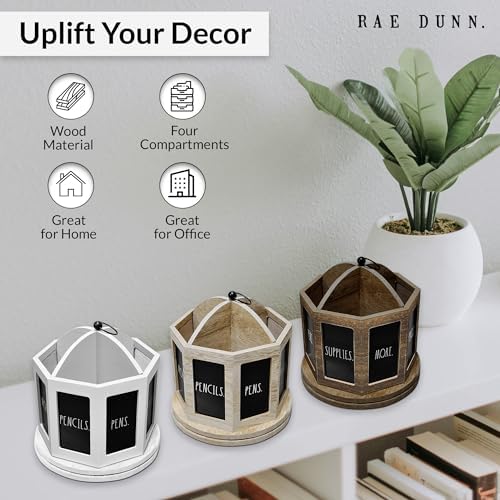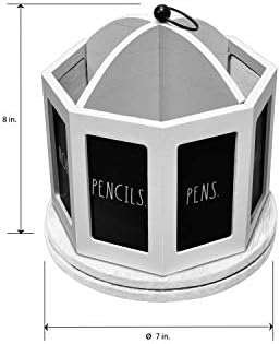 This Organizational Office Supply Spinner by Rae Dunn features Rae Dunn’s signature font. A rustic wooden design inspires a distinct farm and country schoolhouse motif.PRODUCT FEATURES:Dimensions: 8” x 7” x 7”