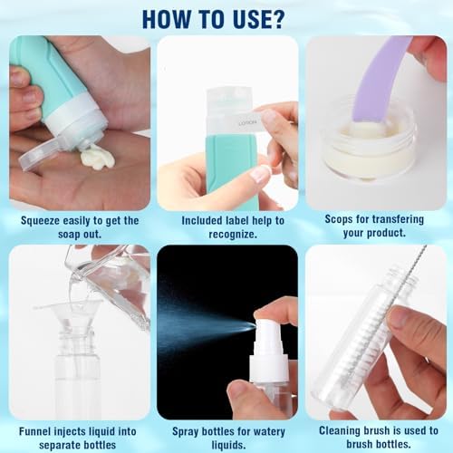 HIGH QUALITY: The travel bottles are made of food-grade BPA-free, odor-free silicone and can be sterilized at high temperatures. Suitable for shampoo, body wash, essential oil,sunscreen, conditioner or lotion, cream, and so on.