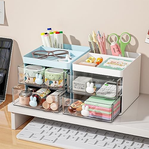 【Small Storage Box with Large Capacity】This storage box is only 12*16*11.5cm. t won’t take up a lot of space, but the multiple compartments can hold a lot of stuff. The top two deep compartments are perfect for longer stationery and the shallow compartment is perfect for things you normally keep handy. The two drawers below hold all kinds of office accessories, scissors, paper clips, sticky notes etc. The transparent view allows you to find what you need quickly.